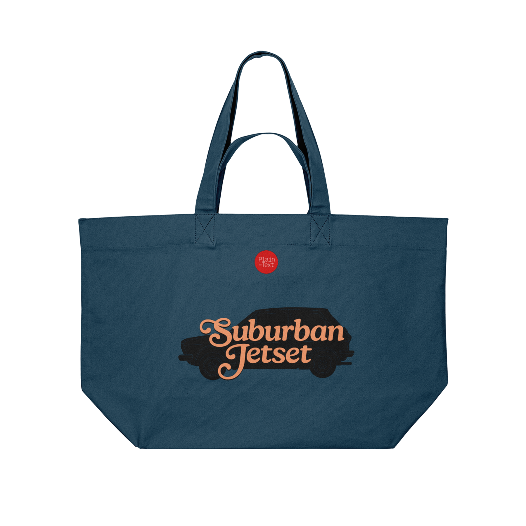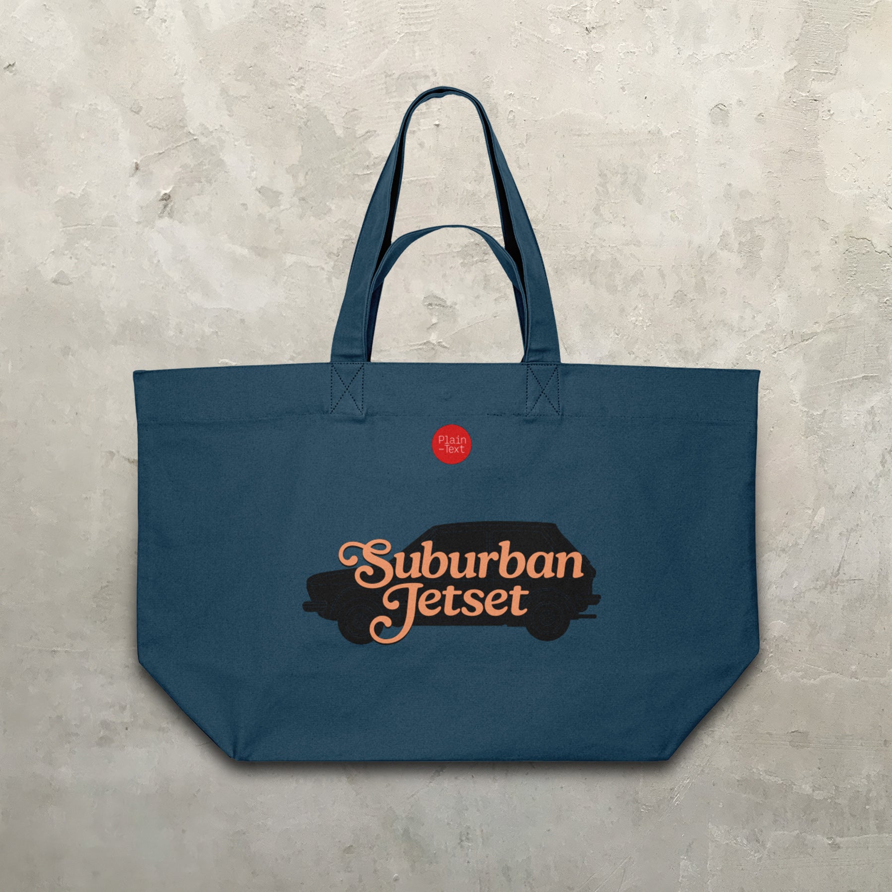 It's pretty roomy at 61 × 38 cm, with a snap closure at the top, and a smaller internal pocket for your bits and bobs. Printed on one side only with our Suburban Jetset graphic.